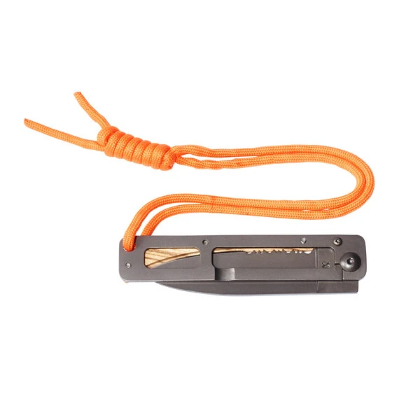 Die angedeutete Griffschale aus hartem Zebrano-Holz dient als Klingenschutz bei geschlossenem Messer. Mit 80 cm langem, 3 mm starkem Paracord. Insgesamt ein klasse Verhältnis von Größe/Klingenlänge und Gewicht – für das Papagayo Skinny ist in der Tasche oder im Rucksack wohl immer ein Platz zu finden!