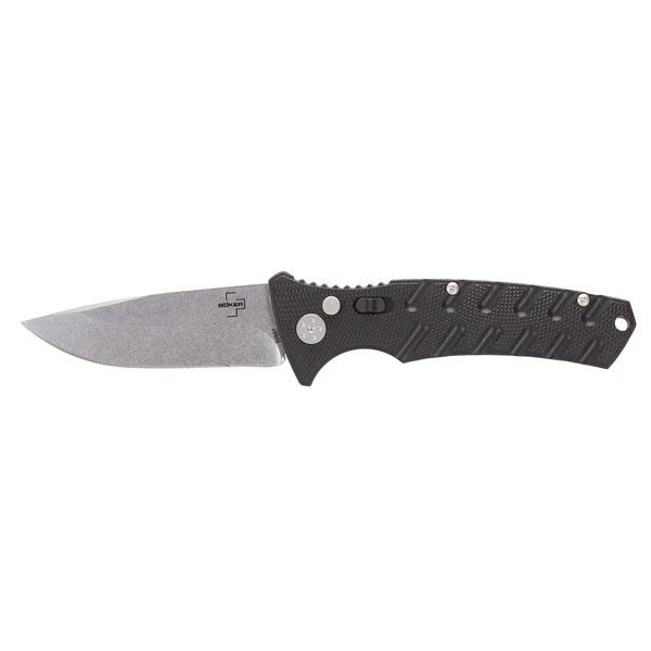 Wenn du bei deinen Arbeiten nur eine Hand frei hast, kommt dir die Automatikfunktion des Strike Droppoints zu Hilfe. Auf Knopfdruck wird die Verriegelung gelöst und die Klinge wird durch den Federmechanismus in Arbeitsposition gebracht und festgestellt. Hergestellt aus AUS-8 Stahl und mit einem Stonewash-Finish versehen. Der Taschenclip kann Tip-up oder Tip-down befestigt werden.