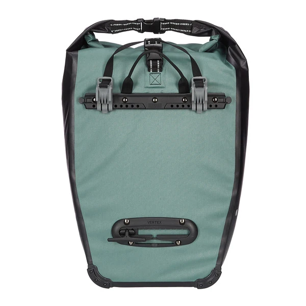 Auf einer durchgängigen Schiene kannst du die federbelasteten Haken auf deinen Gepäckträger einstellen. Unten lässt sich ein T-förmiges Haltestück ebenfalls werkzeugfrei einstellen. Außerdem kannst du den T-Haken auf der Taschenrückseite der Bike Bag Rolltop ZeroPVC auch flach wegklappen. Das ist praktisch, wen du die Fahrradtasche abseits vom Fahrrad über der Schulter trägst.