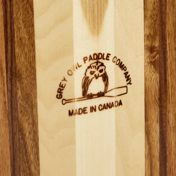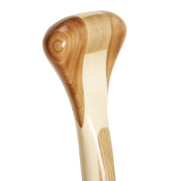 Das schöne Holzpaddel hat ein recht langes, mittelbreites Blatt, für dessen individuelles Muster eine Mischung aus Kirsche, Linde, Walnuss und Esche verantwortlich ist. Eine weit hochgezogene PU-Kante schützt das Blatt. Der mehrfach laminierte Schaft endet in einem asymmetrischen Palm-Griff.
