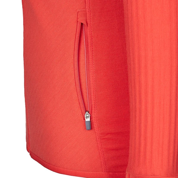 Die Innenseite der Jacke ist schön flauschig. Die Struktur liegt kuschelig auf der Haut und ist besonders wärmespeichernd. In den Reißverschlusstaschen lassen sich kleine Dinge wie GPS, Energieriegel oder Smartphone sicher verstauen. Versetzte Seiten- und Schulternähte sorgen für Komfort beim Tragen eines Rucksacks und dank Daumenschlaufen und umschlagbarer Bündchen bleiben die Hände schön warm. Dazu wärmt der hohe Stehkragen deinen Hals.