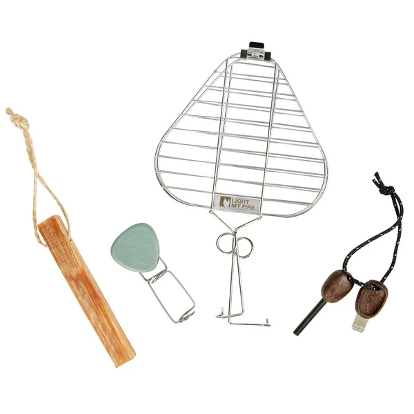 GrandPa’s FireGrill ist ein klappbarer Grillrost, der in seiner Mitte Würstchen, Fleisch oder Gemüse sicher und verlustfrei festhält. Mithilfe eines Stocks kannst du den Grillrost über die Glut halten. Geht es größeren Würstchen, Maiskolben oder Marshmallows an den Kragen, greifst du zu GrandPa’s FireFork Bio. Die Gabel wird ebenfalls an einem Stock befestigt und richtet dank ihrer Schutzkappe im Gepäck keinen Schaden an. Damit das Feuer überhaupt anfängt zu brennen, befindet sich ein Tinder-on-a-Rope (Fatwood) und ein Swedish FireSteel scout Bio (Feuerstarter) im Paket. Damit kannst du bei jeder Witterung ein Feuer entfachen.