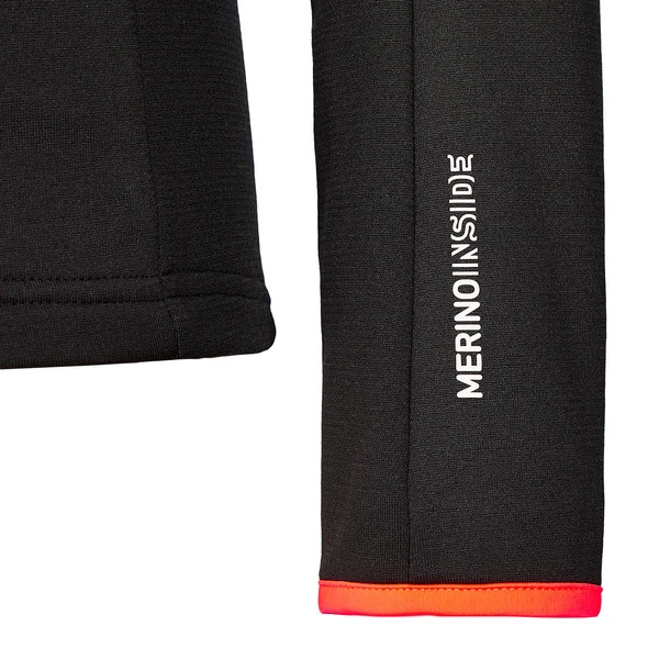 Die Kombination aus Polyester (außen) und Merinowolle (innen) überzeugt mit starkem Feuchtigkeitstransport, guter Wärmeisolation und temperaturregulierenden Eigenschaften. So genießt du schnell wieder ein trockenes Tragegefühl sowie angenehmes Klima, wenn es beim alpinen Einsatz schweißtreibend wird. Das weich aufgebürstete Innenmaterial liegt angenehm auf der Haut und hält dich schön warm. Die Waffelstruktur verbessert den Transport von Feuchtigkeit und verringert das Packmaß. Und dank Elasthan kannst du dich am Fels oder auf der Piste uneingeschränkt bewegen.