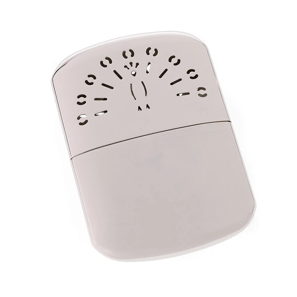 Ein hochwertiger, ausgesprochen flacher, japanischer Taschenofen für Feuerzeug-Benzin. Die Füllung reicht – je nach Sauerstoffzufuhr – max. 12 h. Durch flammenlose Katalysatortechnik verbrennt das Benzin sehr sauber und geruchlos. Das verchromte Metallgehäuse liegt angenehm in der Hand.