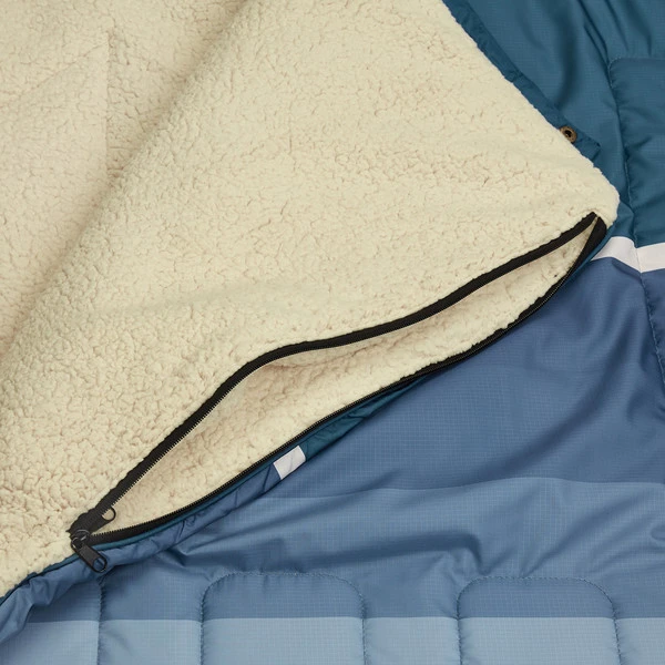 Beide Seiten der Decke bestehen aus unterschiedlich verarbeitetem Polyester. Die glatte Außenseite aus Ripstop Polyester ist bunt gemustert und aus recycelten PET-Flaschen hergestellt. Eine wasserabweisende Imprägnierung sorgt auf dieser Seite dafür, dass Spritzwasser abtropft und Schmutz nicht so leicht angenommen wird. Die weiche Teddyfleece-Seite ist kuschelig warm und für kühle Frühlings- und Herbsttage bestens geeignet. Bei Verschmutzung kannst du die Cloudtouch Blanket in der Waschmaschine reinigen.